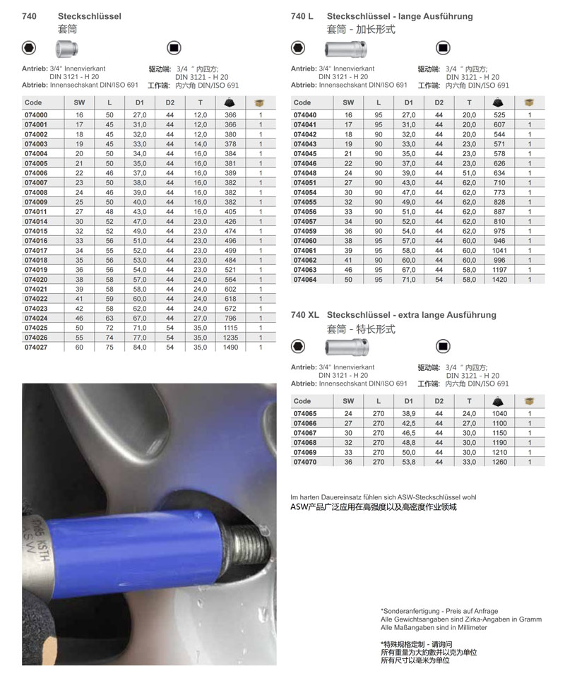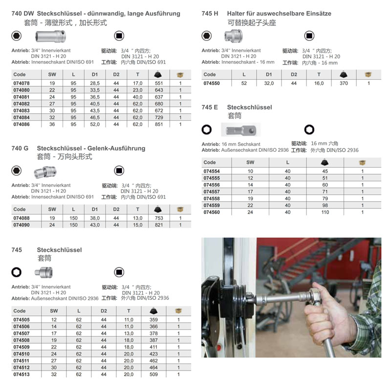 扳手套筒 - 驱动:E 6,3 - 14“外六角